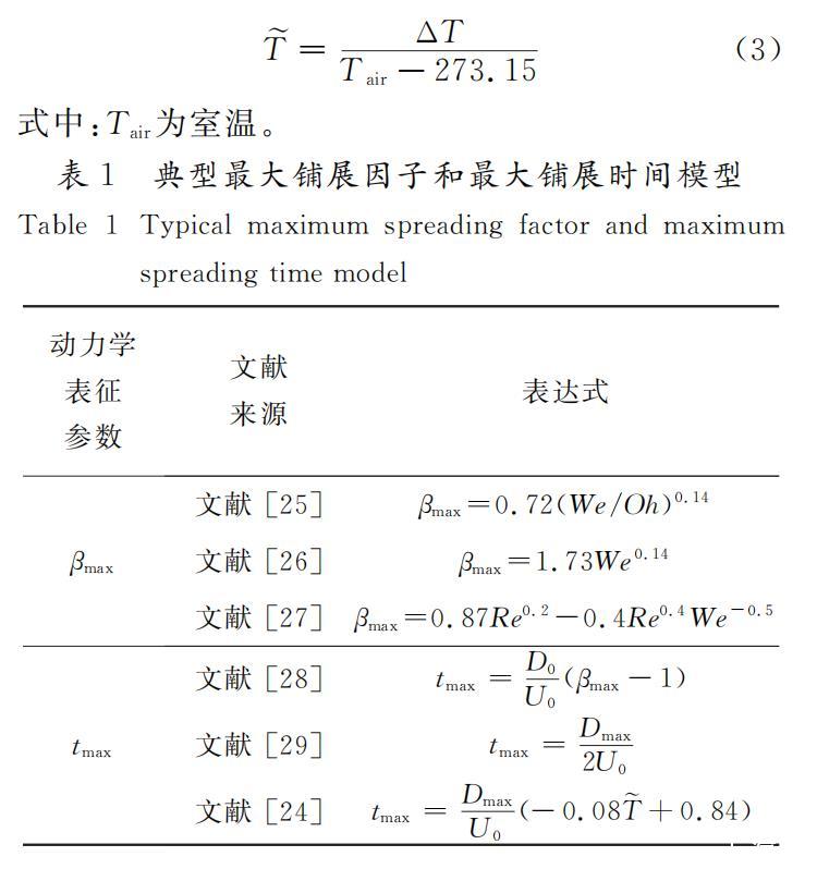 如表1所示,Bayer和Megaridis認為液滴沖擊水平壁面的最大鋪展因子與韋伯數(shù)、奧內佐格數(shù)有關,并提出了相關關聯(lián)式。Roisman認為最大鋪展因子與雷諾數(shù)、韋伯數(shù)均有關,他采用半假設半理論的方法,從動量守恒理論出發(fā),提出了最大鋪展因子的表達式。針對最大鋪展時間,Wildeman等認為,最大鋪展時間與最大鋪展因子有關,結合實驗數(shù)據(jù),對最大鋪展時間進行了修正。Shang等探究了水滴沖擊過冷水平壁面的鋪展動力學行為,并將水平壁面過冷度引入最大鋪展時間模型,重新定義無量綱過冷溫度