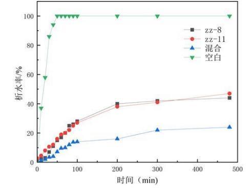利用析水率評價生物表面活性劑作用原油后形成水包油型乳狀液的穩定性,析水率數值越小,說明乳狀液越穩定,體系的乳化性能越強。從圖中可以看出隨著時間的延長各組析水率不斷增加,一段時間后ZZ-11、ZZ-8、混合菌劑的析水率穩定,分別為47%、44%和16%(如圖5所示)。