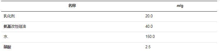 氨基改性硅油在未經乳化處理之前,通常為一種油狀或半固態(tài)的物質,不易與水相混合。而氨基改性硅油柔軟劑需要在水中分散均勻,才能被紡織物充分吸收和利用,發(fā)揮柔軟、抗靜電等作用。因此,上述步驟下制得的氨基改性硅油還需要進一步的乳化處理,才能形成氨基改性硅油柔軟劑,否則不能發(fā)揮柔軟劑的作用,反而還會損傷紡織物。室溫下,將乳化劑、氨基改性硅油、醋酸與水按照一定的比例混合,然后200 r/min攪拌5 min,即可制成氨基改性硅油柔軟劑。乳化方案中各物質比例見表1。