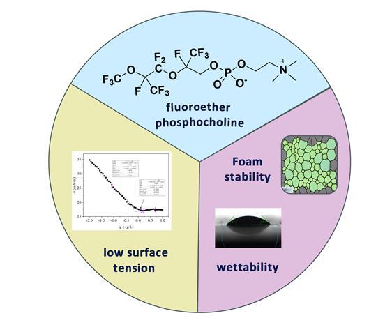 將氧原子引入到氟磷酸膽堿表面活性劑中,會(huì)對磷酸膽堿性能產(chǎn)生怎樣的影響呢?我們設(shè)計(jì)合成了一種新型氟醚磷酸膽堿表面活性劑(圖1b),考慮到長氟碳鏈和長氟醚鏈段具有生物累積性,我們選用了氟碳鏈為6的短鏈結(jié)構(gòu),并向其中插入兩個(gè)氧原子,將新化合物與一個(gè)鏈長相近的氟磷酸膽堿表面活性劑進(jìn)行對比,結(jié)果表明新型氟醚磷酸膽堿表面活性更佳。我們進(jìn)一步探索了新氟醚磷酸膽堿的泡沫性能與潤濕性能,結(jié)果表明氟醚磷酸膽堿的穩(wěn)泡性好、可在聚四氟乙烯(PTFE)上潤濕,是一類具有良好應(yīng)用前景的表面活性劑。