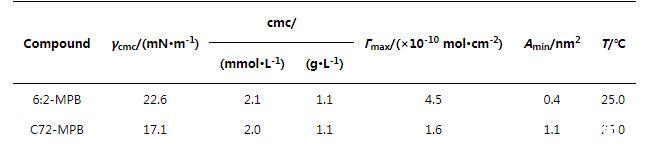 我們進(jìn)一步探究了C72-MPB與化合物6:2-MPB表面性能的差異,使用Gibbs方程對rcmc的值進(jìn)行計(jì)算,由rcmc進(jìn)一步計(jì)算在cmc處每個(gè)分子在空氣~水界面的表面活性劑所占面積,即Amin: