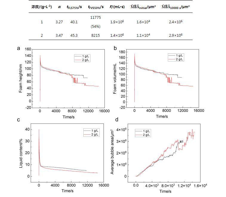實(shí)驗(yàn)結(jié)果表明,1 g/L的C72-MPB和2 g/L的C72-MPB的表面活性劑溶液發(fā)泡倍數(shù)分別為3.3和3.5(見表4),屬于低倍泡沫液,不同濃度下泡沫高度與泡沫體積隨時(shí)間變化見圖4a,4b.
