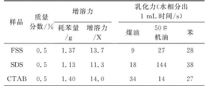 (3)質量分數為0.5%的FSS水溶液對苯的増溶力為13.7,對煤油、50#機油和苯的乳化力分別是9 s、27 s和28 s,FSS在硬水中的穩定性很好達5級。