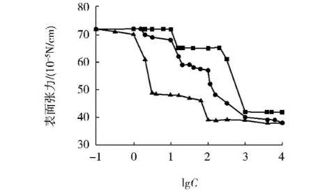 對于在水中溶解度較低的捕收劑,如油酸或低溫下的油酸鈉,加入表面活性劑后,油-水界面張力降低,有助于油酸藥效的發揮。油-水界面張力難以測定,但可用溶液的表面張力來衡量,油酸鈉溶液及加入表面活性劑后的油酸鈉溶液的表面張力與油酸鈉濃度C的關系見圖1。