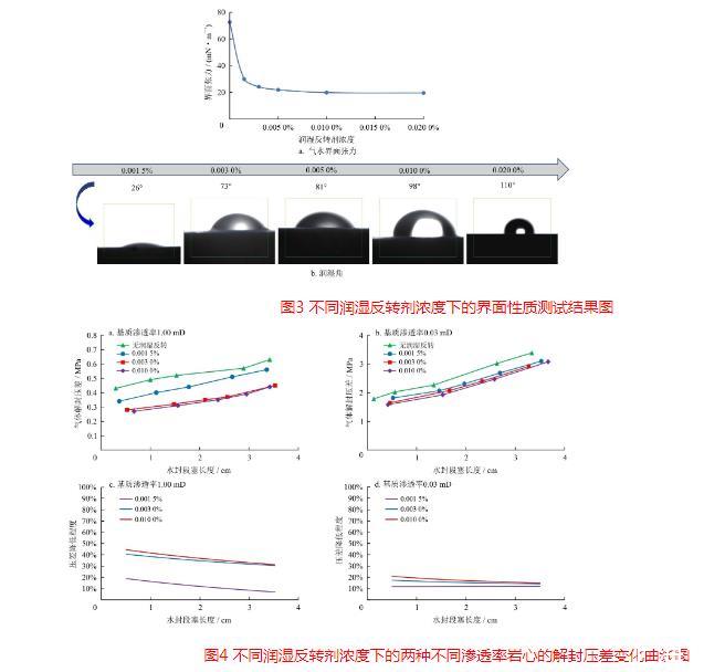 首先測定了不同濃度的潤濕反轉劑TF282溶液的界面張力(圖3-a)。從圖中可以看出,隨著潤濕反轉劑濃度增加,界面張力先迅速下降后逐漸趨于穩定。當潤濕反轉劑濃度為0.001 5%時,氣水界面張力由72.53 mN/m下降至29.96 mN/m,降幅為58.7%;當潤濕反轉劑濃度從0.005 0%增加至0.020 0%時,氣水界面張力下降趨勢減緩,并逐漸穩定在20 mN/m左右。