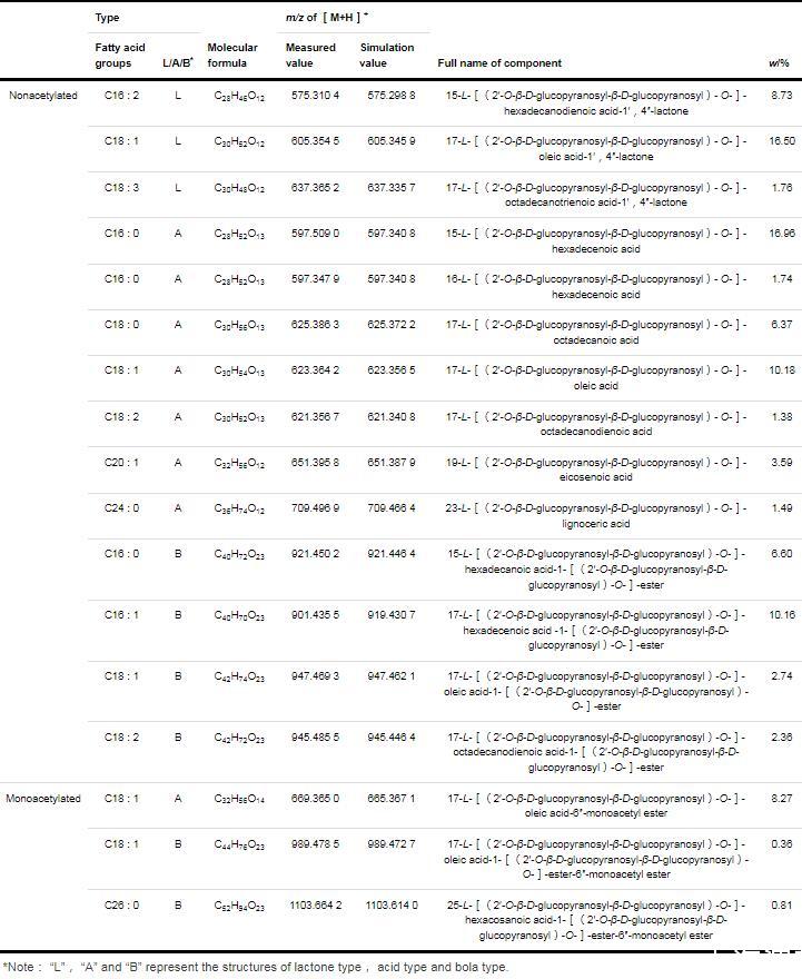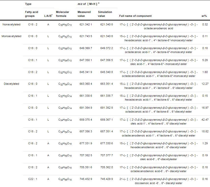 表1乙酰化SLs同系物組分和質(zhì)量分?jǐn)?shù)(Continued from previous page)