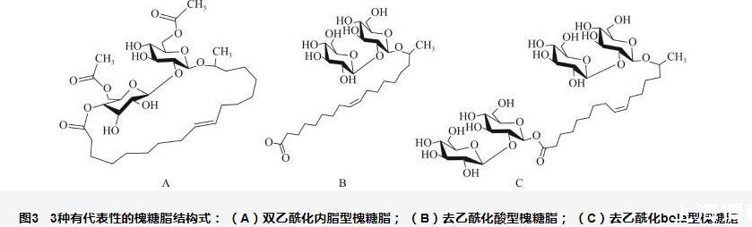 圖3 3種有代表性的槐糖脂結(jié)構(gòu)式:(A)雙乙酰化內(nèi)脂型槐糖脂;(B)去乙酰化酸型槐糖脂;(C)去乙酰化bola型槐糖脂