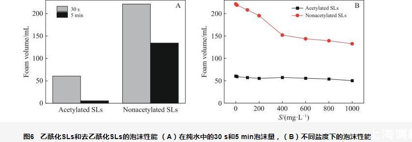 圖6乙酰化SLs和去乙酰化SLs的泡沫性能(A)在純水中的30 s和5 min泡沫量,(B)不同鹽度下的泡沫性能
