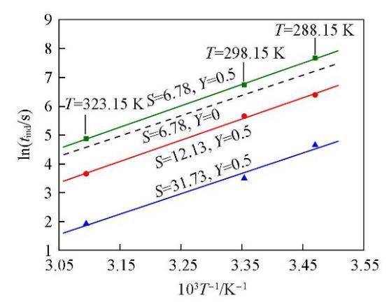 分別在288.15,298.15和323.15 K時研究了NaCl的添加對Li2CO3成核誘導期的影響,每組實驗均在Cl?的超額含量(Y=0.5)的條件下進行,結果見圖4.可知,在同一溫度下,Li2CO3的成核誘導期仍然隨過飽和度的增大而縮短;在同一過飽和度下,Li2CO3的成核誘導期隨溫度的升高而縮短,而且在添加NaCl(Y=0.5)后,溫度對Li2CO3成核誘導期的影響比未添加(Y=0)時更為顯著.如,在過飽和度S=5.76,溫度從288.15 K升高到323.15 K時,添加NaCl后Li2CO3的成核誘導期縮短了73.01%,而未添加NaCl時Li2CO3的成核誘導期縮短了67.89%.