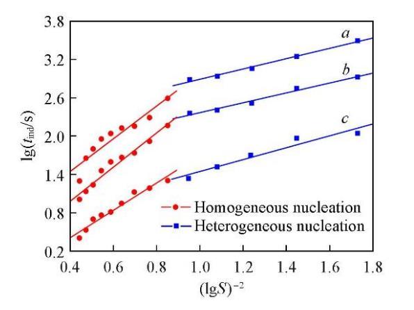 誘導期與初始過飽和度之間存在著很強的依賴關系.當初始過飽和度足夠高時,成核可認為是均相的;當初始過飽和度足夠低時,成核則以非均相為主[37].在恒定溫度下,由晶體成核過程中的lgtind對(lgS)?2作圖可得兩條斜率不同的直線,分別對應著兩種不同的成核機制,即初級均相成核和初級非均相成核[37].由不同溫度時Li2CO3的lgtind對(lgS)?2作圖,結果如圖3所示.可知,成核機制的變化引起了直線斜率的改變,均相成核對應的直線斜率明顯大于非均相成核時的直線斜率(Bhom>Bhet).在較低的過飽和度時,成核以非均相成核為主;而過飽和度增大到12.13以后,成核則以均相成核為主.