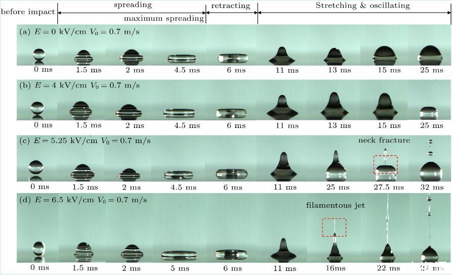 實驗中,通過將液滴釋放高度從25 mm調(diào)整到65 mm來改變液滴的撞擊速度,根據(jù)撞擊前兩個連續(xù)圖像的移動垂直距離除以圖像一幀時間(0.25 ms)得到撞擊初速度V0,其范圍在0.7~1.129 m/s之間。另外通過調(diào)節(jié)高壓電源的輸出電壓U(0~30 kv)來控制電場強度E(