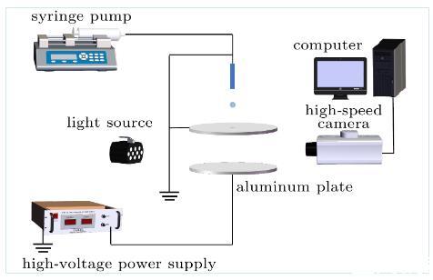 在本實驗中,將兩塊直徑為10cm的圓形鋁板沿著垂直方向放置,其間隔固定為20mm。在上極板中心位置開一個直徑為5mm的孔口,以便液滴從上極板上方滴落,穿過上極板與下極板發(fā)生撞擊行為。為了實現(xiàn)垂直電場的形成,將高壓直流電源與下極板相連,上極板作接地處理,這樣的結(jié)構(gòu)產(chǎn)生了一個垂直電場和一個帶電的基底。此外,不銹鋼針管(G24,外徑0.55m,內(nèi)徑0.27mm)通過毛細管連接到微流注射泵上,使液滴以恒定的撞擊速度滴落到下極板。為了消除靜電對實驗的影響,將針管作接地處理,確保液滴在進入電場之前不攜帶任何感應(yīng)電荷。