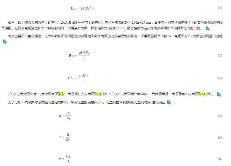 本文主要研究電場強度、低韋伯?dāng)?shù)和不同潤濕性對液滴撞擊固體表面上動力學(xué)行為的影響,采用無量綱韋伯?dāng)?shù)We、電毛細力Cae來描述液滴撞擊過程