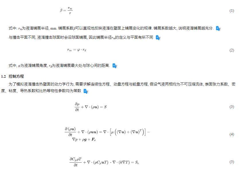 為了模擬液滴撞擊熱壁面的動力學行為,需要求解連續性方程、動量方程與能量方程,假設氣液兩相均為不可壓縮流體,表面張力系數、密度、粘度、導熱系數和比熱等物性參數均為常數