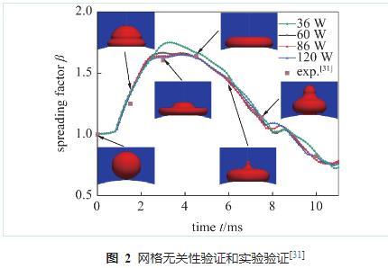 為了定量分析網格數量對數值模擬結果準確性的影響,以液滴撞擊壁面時的鋪展因子作為定量分析指標及網格無關性驗證的評判標準。網格數量從36 w開始增加,每次增長大約30 w,并繪制液滴鋪展因子β隨時間變化與網格數量的關系圖。如圖2所示,網格數在86 w以上時基本不會對模擬結果產生影響,為保證模擬精度并確保求解時間,本文采用86 w網格數作為模型的基準網格數進行模擬。從圖中也可以看出,數值模擬結果與參考文獻中的實驗結果趨于一致,說明本文采用的模型可以用于研究液滴撞擊球面的Leidenfrost現象。