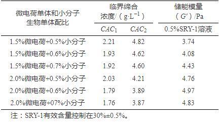 室內合成實驗研究發現,微電荷單體對降低CAC2貢獻較大,用量優選為1.5%~2.5%,而小分子生物單體對降低CAC1貢獻較大,用量優選為0.5%~0.7%,兩種單體共同作用下臨界締合濃度降低和黏彈性提高顯著,最優結果見表3。可見當采用2.0%微電荷單體+0.6%小分子生物單體組合時,溶液具有較強的黏彈性,此時SRY-1的CAC1,CAC2分別為1.79 g·L?1、3.89 g·L?1,對應SRY-1用量接近0.18%、0.4%。