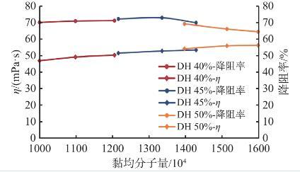 室內通過控制水解度(40%~50%)制備了一系列的SRY-1樣品,配制成濃度為0.5%的溶液,測試聚合物不同分子量下的表觀黏度(30 min)和降阻率(Q=45 L/min)。如圖2所示,在優化的水解度范圍內,SRY-1分子量均在1000萬以上,水解度越高,分子量越高;溶液表觀黏度隨分子量的增大而增大,但降阻率隨分子量的增大呈現先緩慢升高后較快降低的趨勢。主要是因為分子量越高,重復單元數愈多,分子間越易形成鏈纏結,分子鏈具有更大的流體力學體積,溶液黏度增大,當增大到一定范圍,溶液黏彈性受到影響,降阻率就隨之下降。由數據對比,SRY-1分子量控制在1200~1300萬為宜。