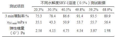數據顯示,隨水解度增大,SRY-1增黏率和表觀黏度都顯著提高,但水解度超過60%后,增黏率又有所降低,SRY-1溶液G'呈現先增大后減小的趨勢。分析認為:在一定范圍內,由于水解度增大,分子鏈更加伸展,分子間共價鍵作用更易形成彈性微觀網絡結構,彈性模量G'增大;隨著水解度繼續增大,聚合物分子流體力學體積持續增大而很難交叉纏繞,黏性行為明顯,彈性減弱,表現為彈性模量G'減小。因此水解度過度提高會造成增黏率下降,溶液黏性增強,彈性降低的負面影響。由數據可知,SRY-1水解度為40%~50%時,SRY-1的3 min增黏率可達90%以上,溶液黏彈性最為顯著。