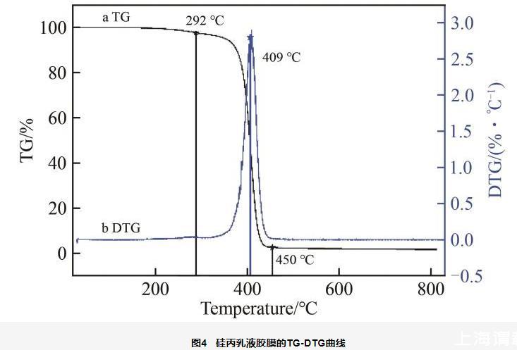 從圖4可以看出,膠膜失重分為3個階段:在292℃前,失重2.54%,此時失去的是膠膜中的水及小分子物質(zhì)的揮發(fā),膠膜并未發(fā)生分解;293~450℃之間為共聚物的熱分解階段,該范圍失重95.30%,且分解速度較快,主要是Si—O、C—C、C—O和C—H鍵的斷裂所致;450~800℃之間失重0.43%,這是共聚物分子鏈的斷裂和分解,分解速度較為緩慢;800℃基本分解完全,僅剩下1.73%的灰分,證明硅丙乳液膠膜具有良好的耐熱性。由DTG曲線可以看出,409℃熱分解速率最大,說明硅丙乳液具有良好的熱穩(wěn)定性,這是因為在共聚物分子中引入了具有較高鍵能的Si—O—Si鍵的結果。