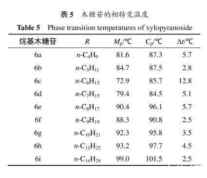 具有液晶特征的化合物因加熱而呈現(xiàn)所謂的“雙熔融轉(zhuǎn)變”的相變現(xiàn)象,當(dāng)加熱達(dá)到其熔點(diǎn)(p)時(shí),結(jié)晶性的固態(tài)首先轉(zhuǎn)變成半透明的液晶態(tài),接著在較高的溫度(p)下轉(zhuǎn)變成各向同性的清亮的液態(tài)。表5所示為木糖苷的相轉(zhuǎn)變溫度。從表5可見:烷基-β-D-吡喃木糖苷屬于一頭一尾(one head one tail)或一頭組一鏈(one head group-one chain)且呈現(xiàn)多態(tài)性的雙親吡喃糖苷分子,在加熱時(shí)其相變發(fā)生在相對(duì)較小的溫度區(qū)間,但都出現(xiàn)了液晶相,且當(dāng)疏水性烷基碳鏈長度為6時(shí),烷基-β-D-吡喃木糖苷相變溫度之差(Δ)較大,其他的都比較接近。在木糖苷中,烷基有助于提升分子取向的穩(wěn)定性,且這種穩(wěn)定性對(duì)液晶相的生成是必要的。但由于烷基-β-D-吡喃木糖苷為環(huán)狀的糖苷只有3個(gè)游離羥基,比烷基--D-吡喃葡萄糖苷少了親水性頭部的糖環(huán)上的羥甲基,也比木糖醇的十二烷基單醚少了1個(gè)游離的羥基,清亮點(diǎn)p不高,所以,得到的烷基-β-D-吡喃木糖苷具有液晶相,但相變溫度范圍(?=p?p)較窄,液晶相的穩(wěn)定性較弱。