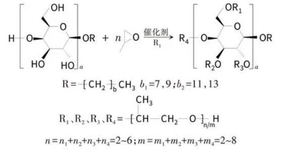 制備路線:烷基糖苷分子中含4個羥基,與環(huán)氧丙烷在催化劑作用下發(fā)生反應(yīng):