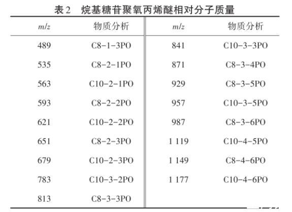 表1中,C8-1為8個(gè)碳的醇和1個(gè)葡萄糖反應(yīng)生成的APG,以此類推,C10-5為10個(gè)碳的醇和5個(gè)葡萄糖反應(yīng)生成的APG。APG加成PO后相對(duì)分子質(zhì)量會(huì)增加58的倍數(shù)。例如,在APG0810PE-5樣品譜圖中,分子質(zhì)量489為C8-1加成3個(gè)PO的產(chǎn)品,535為C8-2加成1個(gè)PO的產(chǎn)品,621為C10-2加成2個(gè)PO的產(chǎn)品,1 119為C10-4加成5個(gè)PO的產(chǎn)品。結(jié)果表明PO基團(tuán)已經(jīng)成功引入烷基糖苷分子中,具體分析數(shù)據(jù)如表2所示。