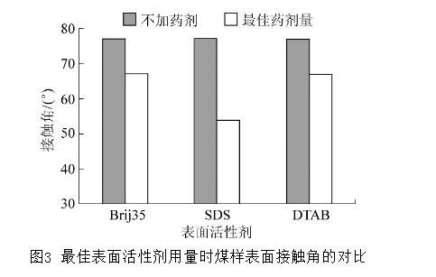 表面活性劑對(duì)煤表面性質(zhì)的影響,本質(zhì)是表面活性劑與煤表面之間發(fā)生了吸附,這種影響可以通過(guò)接觸角的變化體現(xiàn)。通過(guò)測(cè)定煤樣與藥劑(最佳藥劑用量)作用前后接觸角的變化來(lái)表征藥劑對(duì)煤樣表面親疏水性的影響。最佳表面活性劑用量時(shí)煤樣表面接觸角的對(duì)比如圖3所示,3種藥劑作用后煤樣的接觸角均有不同程度的下降,SDS作用后接觸角降低最明顯,降低了23.5°,DTAB和Brij35作用后接觸角降低較少,都只降低了10°。產(chǎn)生這一現(xiàn)象的原因可歸結(jié)為:表面活性劑具有兩親性質(zhì),當(dāng)親水基團(tuán)較多的吸附于煤表面時(shí)可提高煤表面疏水性,而當(dāng)疏水基團(tuán)較多地吸附于煤表面可提高煤表面的親水性。選取的煤樣為浮選精煤,表面自身疏水性強(qiáng),與表面活性劑作用時(shí),更容易使表面活性劑的非極性疏水端吸附于煤表面,極性親水端暴露在外面,從而導(dǎo)致煤樣表面親水性增強(qiáng),接觸角變小。煤樣表面親水性增強(qiáng),導(dǎo)致煤表面吸附水增多或水化膜變厚,因而,從這種意義上來(lái)說(shuō),表面活性劑的加入不利于脫水,還可能使濾餅水分增加。然而,圖1結(jié)果表明添加表面活性劑可以顯著降低濾餅水分,其原因?qū)⑴c下節(jié)表面張力測(cè)試結(jié)果結(jié)合起來(lái)分析。