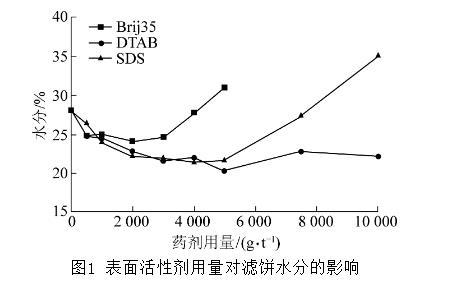圖1表面活性劑用量對(duì)濾餅水分的影響