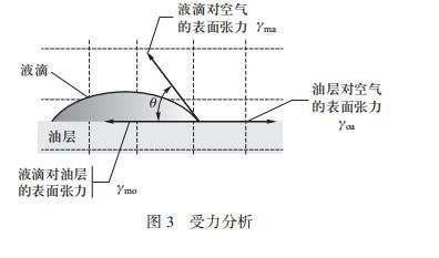 液滴爆炸現象的第二階段邊緣處的液滴產生液滴噴發現象,在該過程中液滴中部較厚的部分不斷向邊緣輸送液體,因此會穩定持續一段時間。為解釋這一階段,先從表面張力入手,因為接觸角的不同,水對油的表面張力大于乙醇對油的表面張力,則混合液體對油層的界面張力介于水和乙醇之間?;旌弦旱沃幸掖嫉谋壤酱?,混合液體對油層的界面張力越小,受到向內的張力減小,這樣整體向外的張力增大,這是產生向外推動的驅動力的重要原因??梢娊缑鎻埩χ苯記Q定了液滴在界面上的擴散和運動。