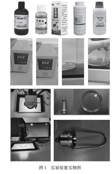 為了還原物理現象,初步探究液滴爆炸的原因,本文首先進行了預實驗。實驗中所用到的物品包括:醫用75%酒精和蒸餾水混合形成水混合物液滴,家用菜籽油用作油池,普通藍墨水染色。在室溫環境下進行實驗,預實驗中發現普通藍墨水染色現象不明顯,改進為采用甲基藍染色劑進行染色。正式實驗時準備了不同種類的水混合物(乙醇、二乙二醇丁醚),不同種類的疏水性物質(硅油、花生油、蓖麻油),不同厚度的疏水性物質(5 mm、10 mm),設置合適的濃度梯度,采用恒溫水浴鍋來測定溫度。在顯微鏡下觀察液滴的運動過程,精準測定液滴大小,利用注射器定量控制滴入液滴的體積,再利用黏度計測量黏性系數,并對實驗誤差進行了修正。