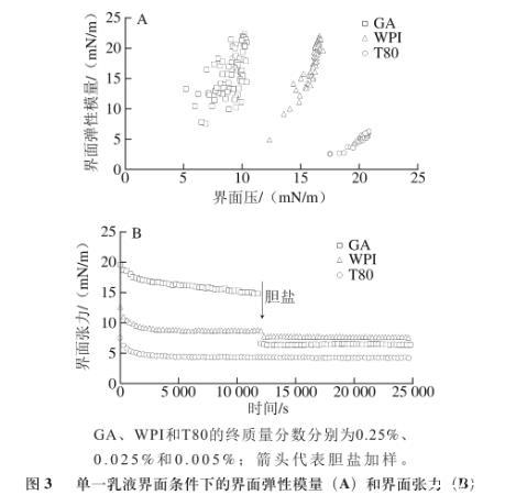 由圖3A可知,GA和WPI界面的彈性模量值基本一致,比T80界面的彈性模量值高很多。說(shuō)明此質(zhì)量分?jǐn)?shù)條件下GA和WPI形成的界面相對(duì)T80有更好的界面黏彈性。這是由于大分子GA和WPI具有較強(qiáng)的空間位阻,在乳滴界面可形成較厚的吸附層,乳滴空間穩(wěn)定性較好,可在一定程度上抵御外力造成的變形。T80屬于小分子表面活性劑,在界面吸附致密整齊,但乳滴的空間穩(wěn)定性較差,易發(fā)生變形和聚集。圖3B表明,在加入膽鹽后,GA界面的界面張力降低值ΔT為8.42 mN/m,T80界面的界面張力基本不變,WPI界面的界面張力降低值ΔT為1.09 mN/m,由此證明T80的抗膽鹽取代能力最優(yōu),其次為WPI和GA。3種乳化劑所呈現(xiàn)的界面特性與3種乳液的消化動(dòng)力學(xué)規(guī)律相吻合。采用界面流變技術(shù)可有效評(píng)價(jià)乳化劑的界面特性,腸液組分對(duì)乳滴界面特性造成的影響以膽鹽取代最為顯著。因此,通過(guò)評(píng)價(jià)膽鹽在界面的取代能力,可在一定程度上判斷乳液的脂肪消化動(dòng)力學(xué)規(guī)律。