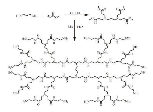 以1,3-丙二胺為反應中心核,丙烯酸甲酯和乙二胺為支鏈,通過“一鍋法”合成h-PAMAM。具體的反應過程可以分為以下幾步,首先將30 mL甲醇加入到三口燒瓶中,向其中加入1,3-丙二胺(0.1 mol),邊攪拌邊滴加丙烯酸甲酯(0.4 mol),隨后混合物在25℃下繼續攪拌反應24 h。然后依次將乙二胺(0.28 mol)和丙烯酸甲酯(0.24 mol)滴加入燒瓶中,繼續反應24 h。最后,在真空狀態下采用程序升溫:60℃反應1 h,80℃反應1 h,100℃反應2 h,120℃反應2 h,140℃反應2 h。最終得到淺綠色、高黏度的樣品。合成路線如圖1所示。