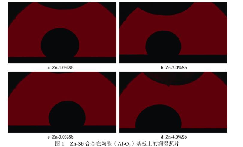 液態(tài)金屬表面張力是一個(gè)極為重要的物理化學(xué)性質(zhì),在液態(tài)金屬成形加工過程中,表面張力與金屬的流動性及其與金屬基板間的潤濕性密切相關(guān)。由于合金熔體與陶瓷的不潤濕性,可以通過計(jì)算得到較準(zhǔn)確的合金熔體表面張力,并進(jìn)行不同Zn-Sb合金熔體在陶瓷(Al2O3)基板上的潤濕實(shí)驗(yàn),圖1為實(shí)驗(yàn)條件下不同Zn-Sb合金熔體在陶瓷基板上的潤濕照片。
