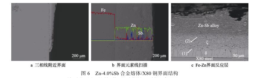 圖6c展示了經(jīng)硝酸酒精腐蝕后,Zn-Sb合金與X80鋼潤濕的界面反應(yīng)產(chǎn)物層。利用EDS沿界面進(jìn)行定量檢測,發(fā)現(xiàn)界面處存在一定量的Zn、Fe和極少量的Sb,Zn-Sb合金熔體與X80鋼發(fā)生反應(yīng)生成了鐵鋅化合物。能譜分析表明,圖6c中箭頭所示(1)、(2)處的含鐵量分別為8.30%和5.23%,為典型的δ(FeZn10)相和ζ(FeZn13)相,ζ層緊鄰Zn-Sb合金熔體,而δ層呈柵狀,位于ζ層的下方,這與徐其林等的研究結(jié)果一致。同時(shí)發(fā)現(xiàn),隨著Sb含量的增加,潤濕反應(yīng)所形成的界面產(chǎn)物層并未發(fā)生顯著變化,說明Sb元素的添加對Fe-Zn反應(yīng)基本沒有影響。