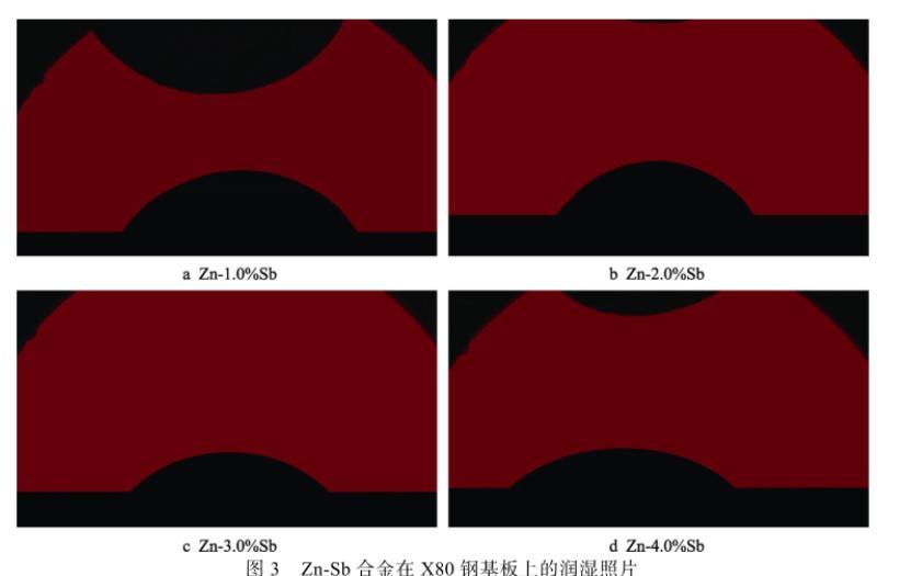 在實(shí)驗(yàn)過程中,鋅合金熔體在基板上的潤濕時(shí)間很短,潤濕體系會很快達(dá)到平衡,且鋅合金熔體中Sb元素的添加量很少,根據(jù)Fe-Sb二元相圖可知,在450℃滴落溫度下,F(xiàn)e與Sb之間的固溶度極小并無化合物生成,與X80鋼基板發(fā)生反應(yīng)的元素主要是Zn,可以認(rèn)為Sb添加對降低鋅液與X80鋼基體之間界面張力σsl的影響相對較小,由此Zn-Sb合金熔體與X80鋼基板之間的潤濕角主要取決于鋅合金熔體的表面張力σlv,表面張力σlv越小,接觸角越小,即鋅合金熔體與X80基板之間的潤濕性越好。