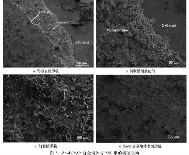 綜上分析,Zn-Sb合金熔體潤濕X80鋼時(shí),Sb作為表面活性元素在鋅液表面富集,使其在界面反應(yīng)過程中降低鋅液表面張力,從而提高潤濕性。在鋅合金熔體與X80鋼的反應(yīng)三相線外形成前驅(qū)膜,前驅(qū)膜的存在使隨后的鋅合金熔體在其上鋪展,進(jìn)而促進(jìn)潤濕。