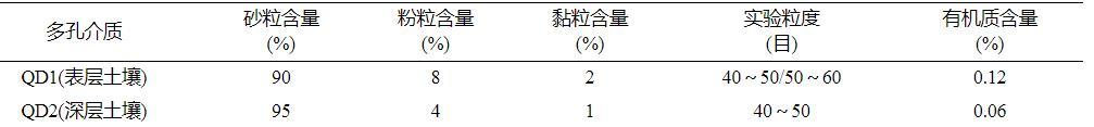 本研究選用的兩種多孔介質分別為QD1(表層20~40cm土壤)和QD2(地下50~100cm深層土壤),均采自青島市嶗山區某農田。經過自然風干后,將其篩分為40~50目和50~60目。實驗選用土壤中的金屬氧化物含量均較低,主要差異為有機質含量。土壤樣品的性質見表1。