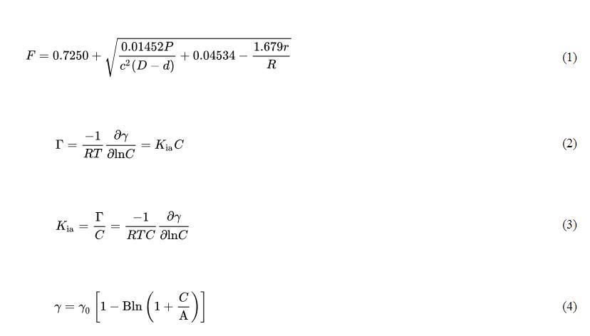 實際表面張力(γ)由儀器表面張力讀數(P)、校正因子(F)和實驗相關常數相乘得到。校正因子計算如公式(1)所示;氣-水界面吸附系數通過Gibbs吸附等溫方程得到,見公式(2)和公式(3);將Szyszkowski方程應用于表面張力數據,見公式(4),該方程提供了一種計算數值的統一方法。
