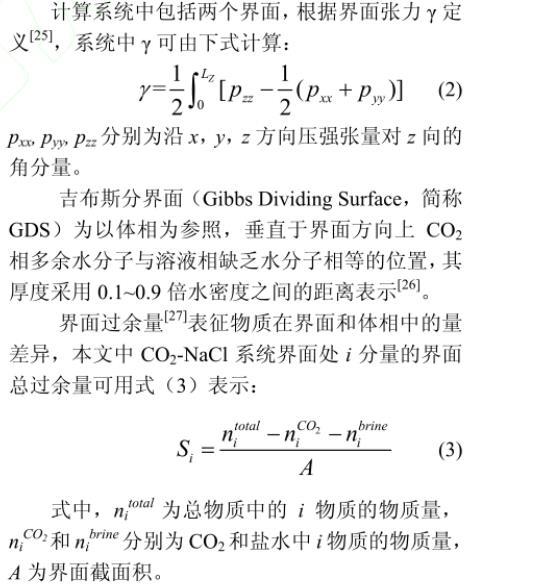 界面過(guò)余量表征物質(zhì)在界面和體相中的量差異,本文中CO2-NaCl系統(tǒng)界面處i分量的界面總過(guò)余量可用式(3)表示