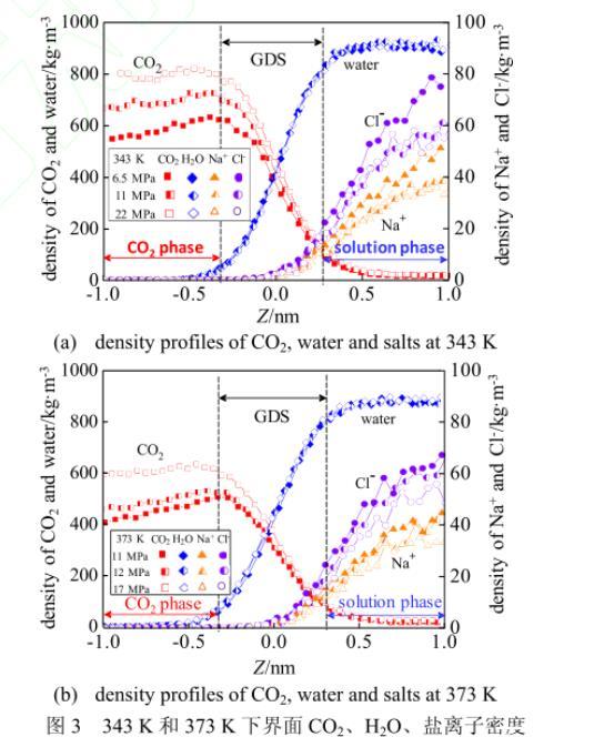 為從分子角度更加詳細(xì)地描述界面性質(zhì)的變化,本文選取并計(jì)算了界面處2 nm厚度區(qū)域的CO2、H2O、Na+及Cl-的密度,結(jié)果示于圖3。由圖3可以觀測(cè)到:當(dāng)從CO2相向溶液相過(guò)渡時(shí),CO2密度逐漸下降,H2O密度則逐漸上升;而鹽離子密度則從界面中心向溶液相,由0逐漸達(dá)到某一穩(wěn)定值。由圖3可以看出,溫度一定時(shí),CO2在CO2相的密度隨著壓強(qiáng)的升高逐漸升高。由[圖3(a)]可以看出,溫度為343 K時(shí),當(dāng)壓強(qiáng)由6.5 MPa升高至22 MPa,CO2相的CO2密度從580 kg·m-3升高至800 kg·m-3左右;而溫度為373 K時(shí)[圖3(b)],當(dāng)壓強(qiáng)由11 MPa升高至17 MPa,CO2相的CO2密度從約420 kg·m-3升高至600 kg·m-3左右。此外,對(duì)比圖3(a)和(b)還可知,當(dāng)壓強(qiáng)恒定在11 MPa時(shí),溫度由343 K升高到373 K,CO2相的CO2密度則由700 kg·m-3降至420 kg·m-3左右。