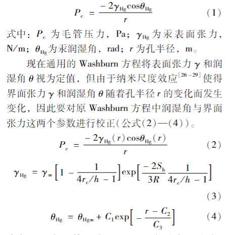 式中:Pc為毛管壓力,Pa;γHg為汞表面張力,N/m;θHg為汞潤濕角,rad;r為孔半徑,m;γ∞為孔半徑無窮大時汞的表面張力,γ∞=480 mN/m;θHg∞為孔半徑無窮大時汞的潤濕角(θHg∞=140°);Sb為吸附熱,Sb=Eo/Tb=93.99 J/(mol·k),Eo為蒸發焓,Tb為沸點;R為理想氣體常數,R=8.314 J/(mol·k);h為有效分子或原子直徑,h=0.302 nm;rc為液滴曲率半徑,rc=-r/cosθ,nm;常數C1、C2、C3分別為18.345、1.719、2.711 7。