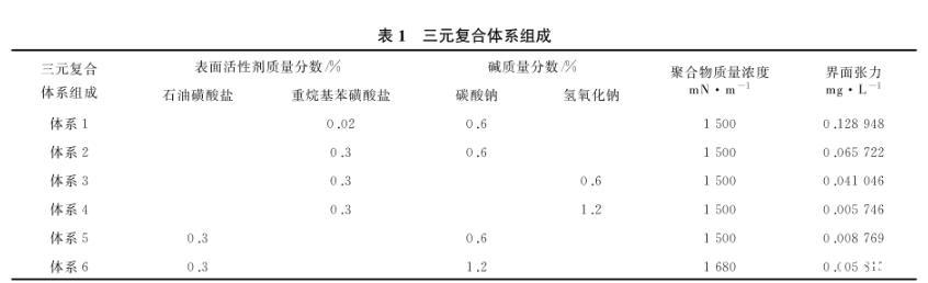 (4)實驗用三元復(fù)合體系的組成見表1,界面張力分布在3個數(shù)量級。