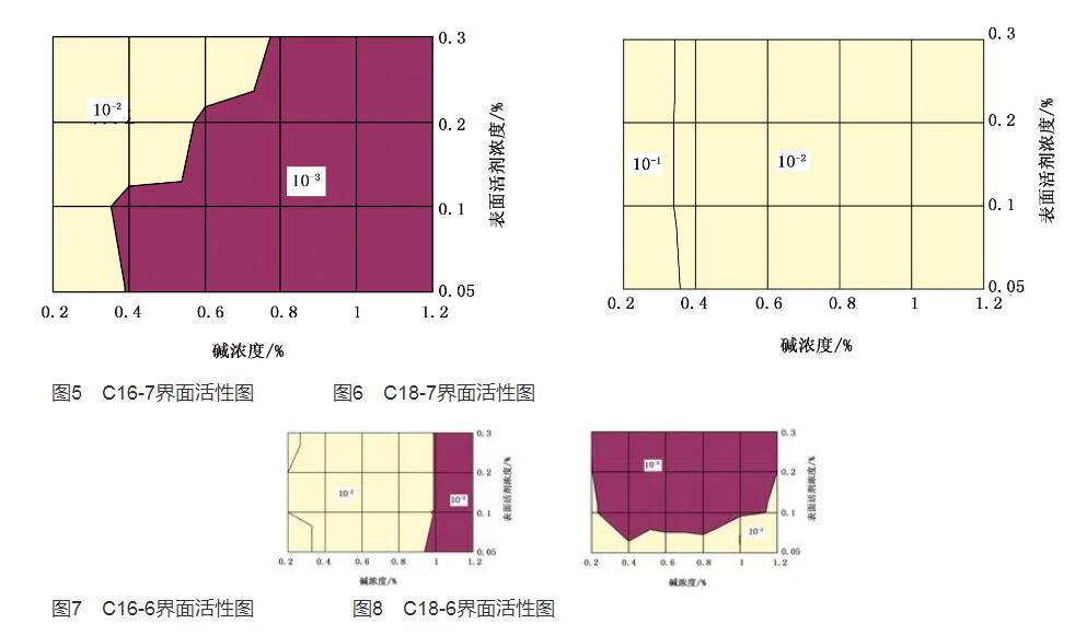 1)碳鏈長度對界面活性的影響對用濃度為1500mg/L的聚合物和不同碳鏈長度的烷基苯磺酸鹽配置的弱堿三元復(fù)合體系進(jìn)行界面活性檢測(見圖5~圖8)。圖5和圖1對比表明,帶有支鏈的C16烷基苯磺酸鹽形成超低界面張力時堿濃度和表面活性劑濃度范圍較寬;圖6和圖4對比表明,帶有支鏈的C18烷基苯磺酸鹽在相同濃度范圍內(nèi)沒有形成超低界面張力。因此,帶有支鏈的C16烷基苯磺酸鹽界面活性好于帶有支鏈的C18烷基苯磺酸鹽。