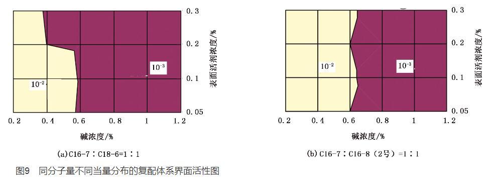 4)表面活性劑平均相對分子量越高,界面張力范圍向低堿方向偏移和拓展;反之平均相對分子量越低,界面張力范圍向高堿方向偏移和拓展。
