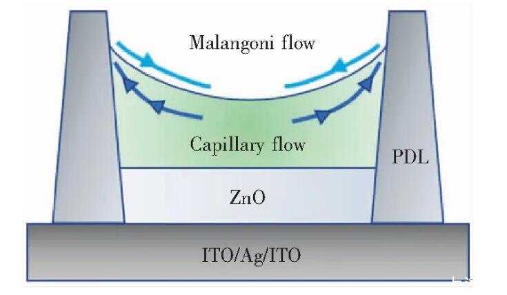 墨滴的鋪展?fàn)顟B(tài)如圖2(a)所示,可以根據(jù)楊氏方程描述固-液-氣三相界面之間關(guān)系,σLVcosθ=σSV-σSL,這里σLV、σSV、σSL分別是液體-固體、固體-氣體、固體-液體表面張力,根據(jù)測(cè)得的墨水在ZnO襯底上的接觸角θ=5°可知,量子點(diǎn)墨水在ZnO襯底上具有非常好的浸潤(rùn)性。圖2(b)為量子點(diǎn)墨水在像素結(jié)構(gòu)的基板上鋪展的示意圖,由于器件第一層的ZnO是通過旋涂方法制備,導(dǎo)致像素坑壁上附著了ZnO層。根據(jù)上述的楊式方程,液滴在落入像素坑后,液滴邊緣在三種表面張力的合力作用下,沿著隔離柱向上移動(dòng),由于ZnO對(duì)于量子點(diǎn)墨水具有良好的浸潤(rùn)性,最終形成的平衡狀態(tài)為很嚴(yán)重的下凹液面。
