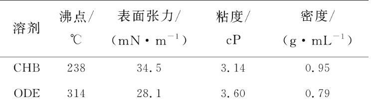 表1為CHB和ODE的沸點(diǎn)、表面張力等物理參數(shù),在選擇量子點(diǎn)溶劑時(shí),利用了雙溶劑體系增強(qiáng)馬蘭戈尼流的基本原理。CHB是一種沸點(diǎn)較低、表面張力較高的溶劑,而ODE則是沸點(diǎn)高、表面張力低的溶劑,可以有效地增強(qiáng)自外而內(nèi)的馬蘭戈尼流;同時(shí)兩種溶劑的粘度都較低,并且對(duì)量子點(diǎn)都有較好的溶解性。