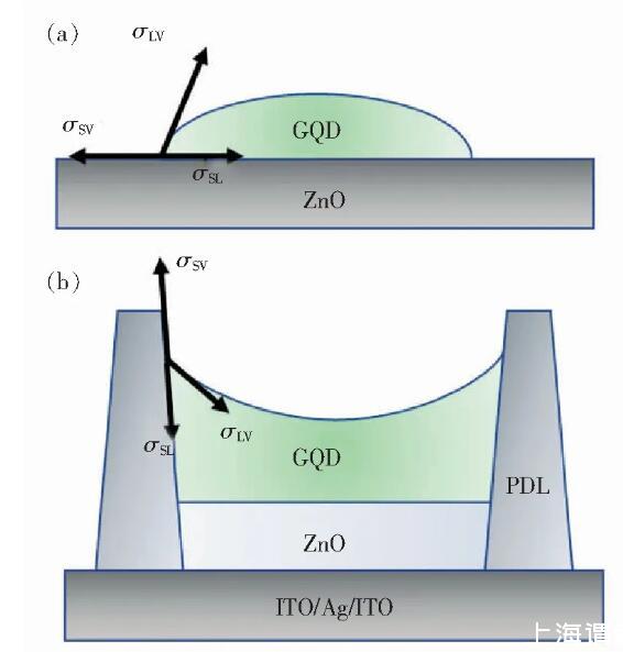 圖2量子點(diǎn)墨水在ZnO襯底上的接觸角示意圖。(a)墨水在平坦ZnO襯底上的接觸角示意圖;(b)墨水在旋涂了ZnO的像素坑基板接觸角示意圖。