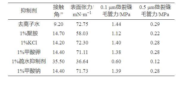 同時從表1中可以看出,疏水抑制劑能夠有效降低溶液的表面張力,當(dāng)微裂縫的寬度為0.1μm時,微裂縫對于去離子水的毛管自吸力達(dá)到1.44 MPa,而加入疏水抑制劑后可以降低至0.60 MPa,而且隨著微裂縫寬度增加毛管自吸力逐漸降低。納米級別的微裂縫具有較高毛管自吸力,所以在體系構(gòu)建時應(yīng)封隔頁巖微納米級裂縫和加入疏水類的處理劑,弱化微納米級裂縫的毛管自吸力。