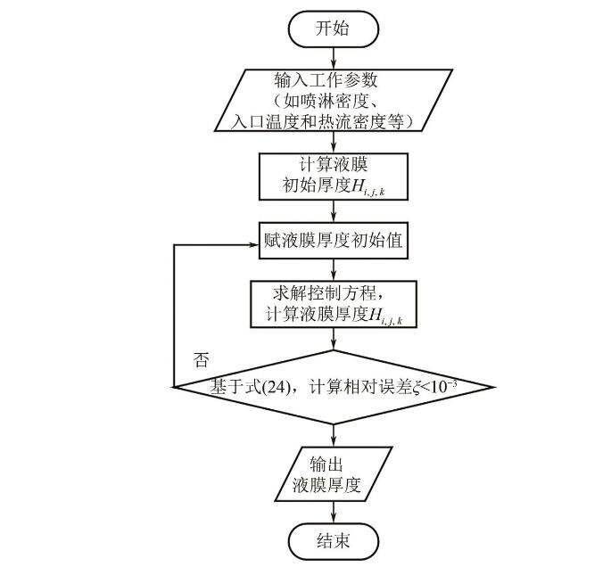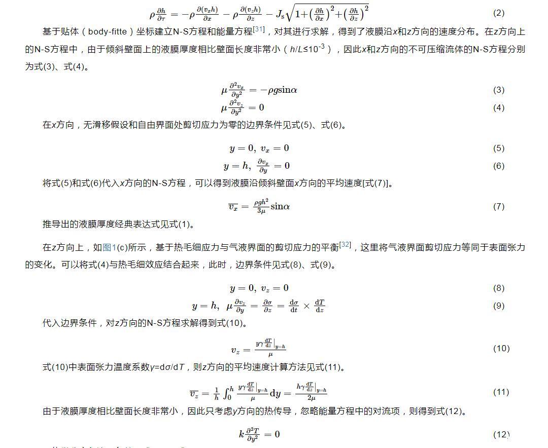 式(1)將作為本文模型計算的迭代初值。之后,Kapitza首次對傾斜平板上流動液膜的流體動力學不穩定性進行了研究,對流動液膜的流動不穩定性和破裂有了初步的認識。隨著實驗方法和測量技術的不斷進步,研究人員通過更高效的實驗和模擬方法對流動液膜進行了深入和廣泛的研究,深化了對液膜流動模式、流動特性和蒸發等內在機制的理解,也為相關的工業應用提供了重要的科學依據。