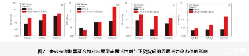 圖7未破殼微膠囊聚合物對延展型表面活性劑與正癸烷間的界面張力穩態值的影響